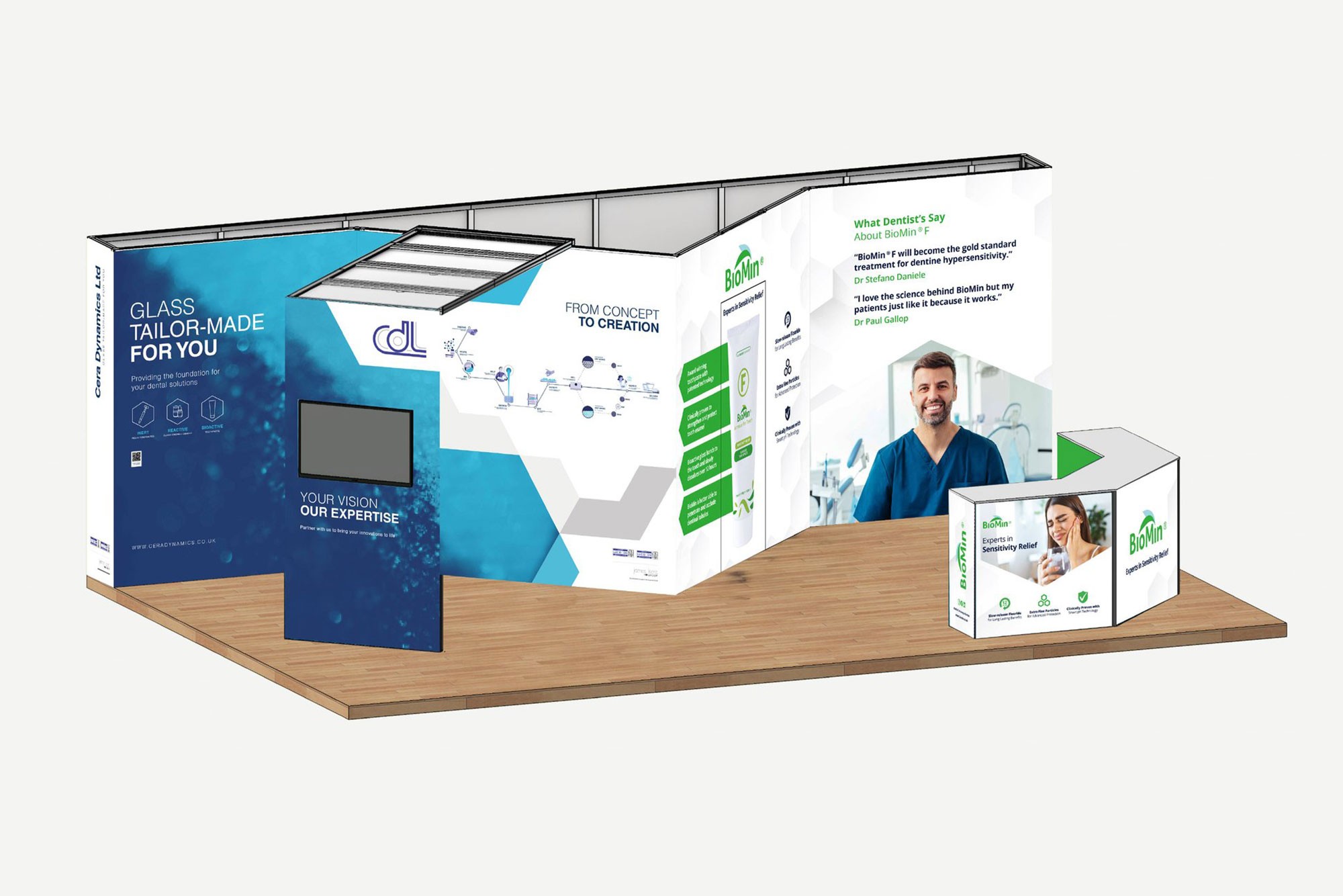 I designed a stand built around process and visual storytelling. A central infographic mapped how Cera Dynamics works with customers to develop tailored solutions, helping visitors quickly understand their role within the wider dental industry.